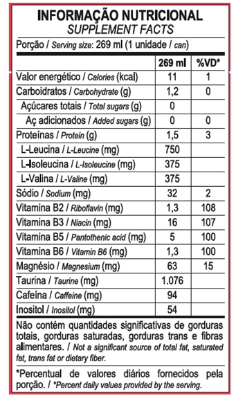 Água gaseificada, taurina, cafeína, inositol, magnésio, vitamina B3 (niacina), B5 (ácido pantotênico), B2 (riboflavina) e B6 (cloridrato de piridoxina), L-leucina, L-isoleucina, L-valina, acidulante ácido cítrico, aromatizante, regulador de acidez citrato de sódio, conservadores benzoato de sódio e sorbato de potássio, edulcorante sucralose (53,8mg/269ml) e corante caramelo IV. NÃO CONTÉM GLÚTEN.