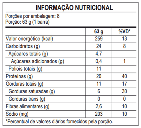 Blend de proteínas (colágeno hidrolisado, proteína concentrada do soro do leite (WPC), caseinato de cálcio e caseína), recheio de ganache sabor chocolate ao leite, cobertura sabor chocolate ao leite, óleo de girassol, farinha de amendoim, crispies de soja (proteína isolada de soja), cacau alcalino em pó, polidextrose, alga Lithothamnion calcareum, cloreto de sódio, edulcorantes xarope de maltitol e sucralose, umectante glicerina, emulsificante lecitina de girassol, aromatizantes e conservador sorbato de potássio. CONTÉM GLÚTEN. CONTÉM DERIVADOS DE LEITE, SOJA E AMENDOIM. PODE CONTER TRIGO, CENTEIO, CEVADA, AVEIA, OVO, AMÊNDOA, AVELÃ, CASTANHA-DE-CAJU, CASTANHA-DO-PARÁ, MACADÂMIAS E NOZES.