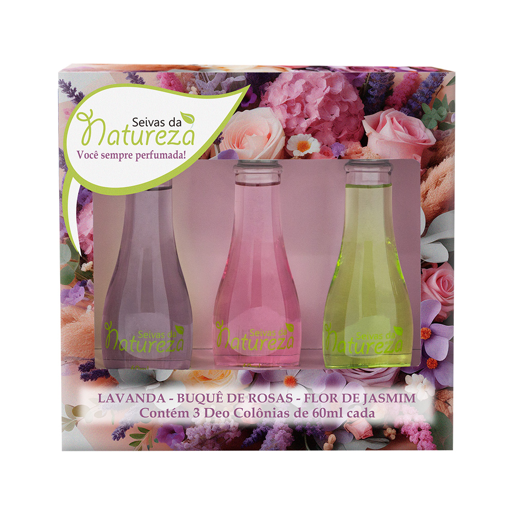 Estojo com 3 Deo Colônias – Seivas da Natureza 60ml cada – Buquê de Rosas, Lavanda e Flor de Jasmim