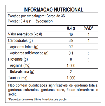 Beta-alanina, isomaltulose, L-arginina, taurina, aromatizantes, acidulante ácido cítrico, edulcorante sucralose, antiumectante estearato de magnésio e corantes artificiais amaranto e azul brilhante fcf. NÃO CONTÉM GLÚTEN.